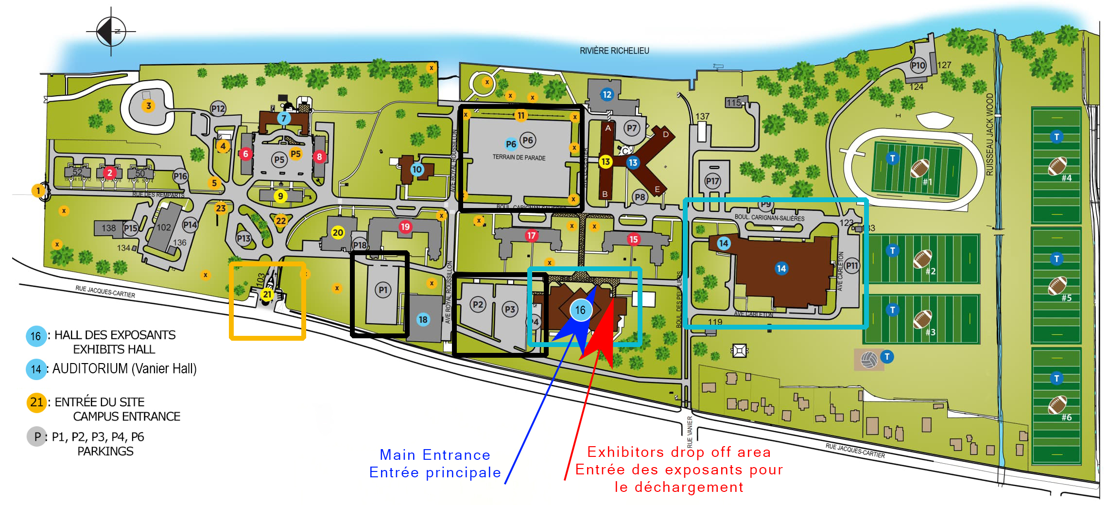 Exhibits loading will be at door Dextraze building, number 3, pointed by the red arrow on the Campus Map